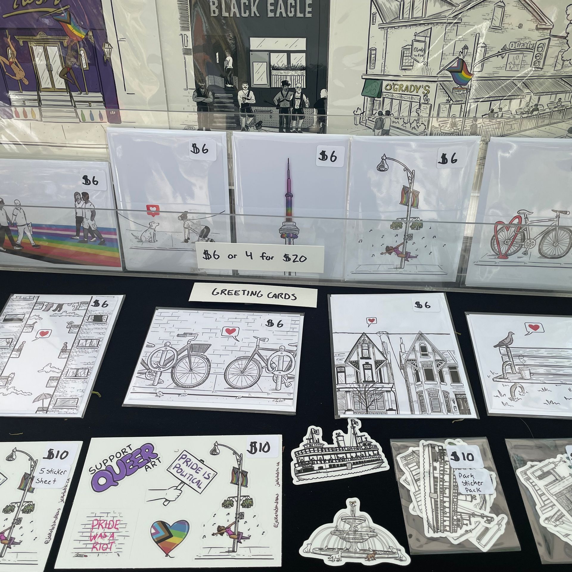 Working primarily in ink with splashes of colour, I capture places and moments with whimsy and narrative depth, often highlighting queer spaces of connection and joy. Since 2015, I have drawn hundreds of custom illustrations for people and sold artwork through my online shop.