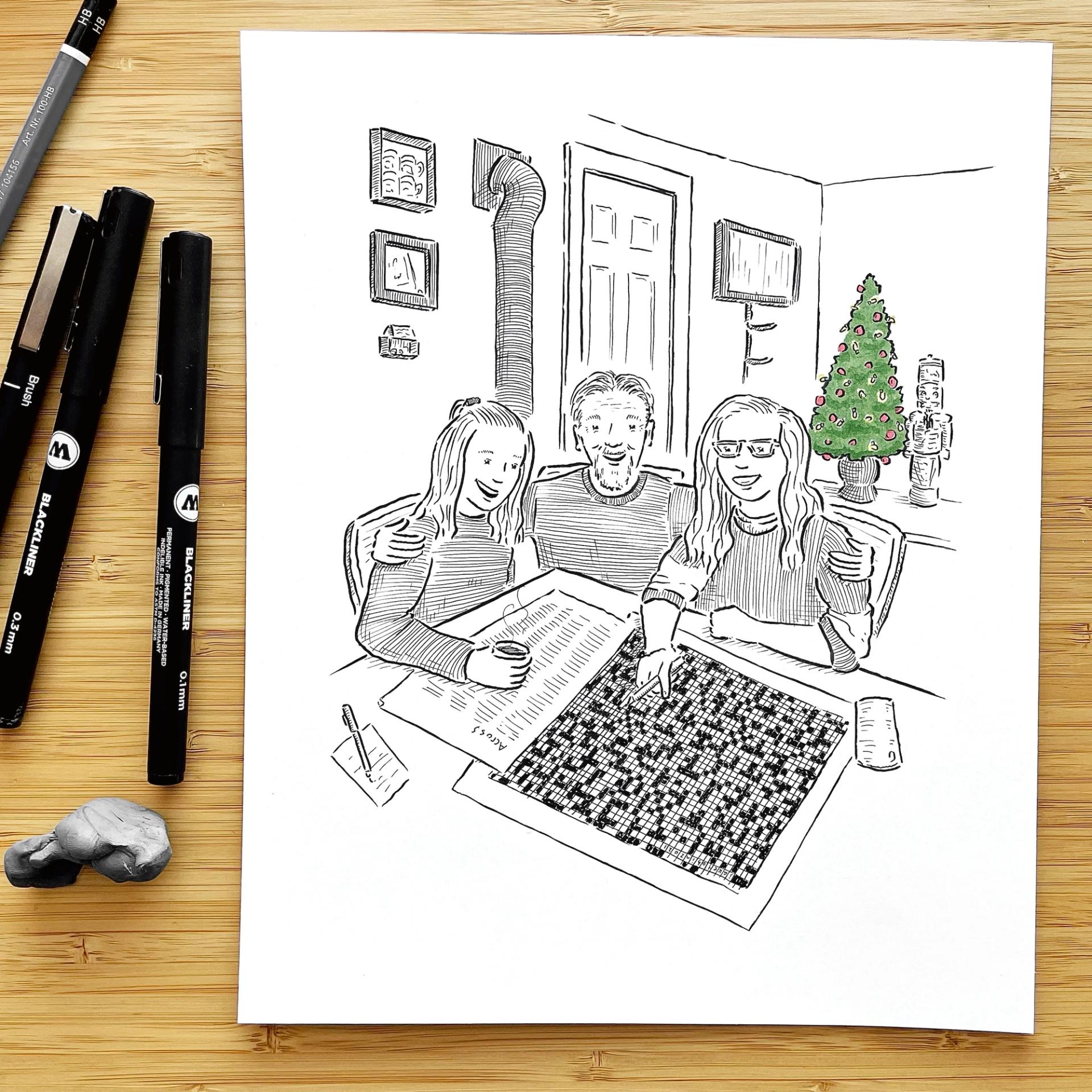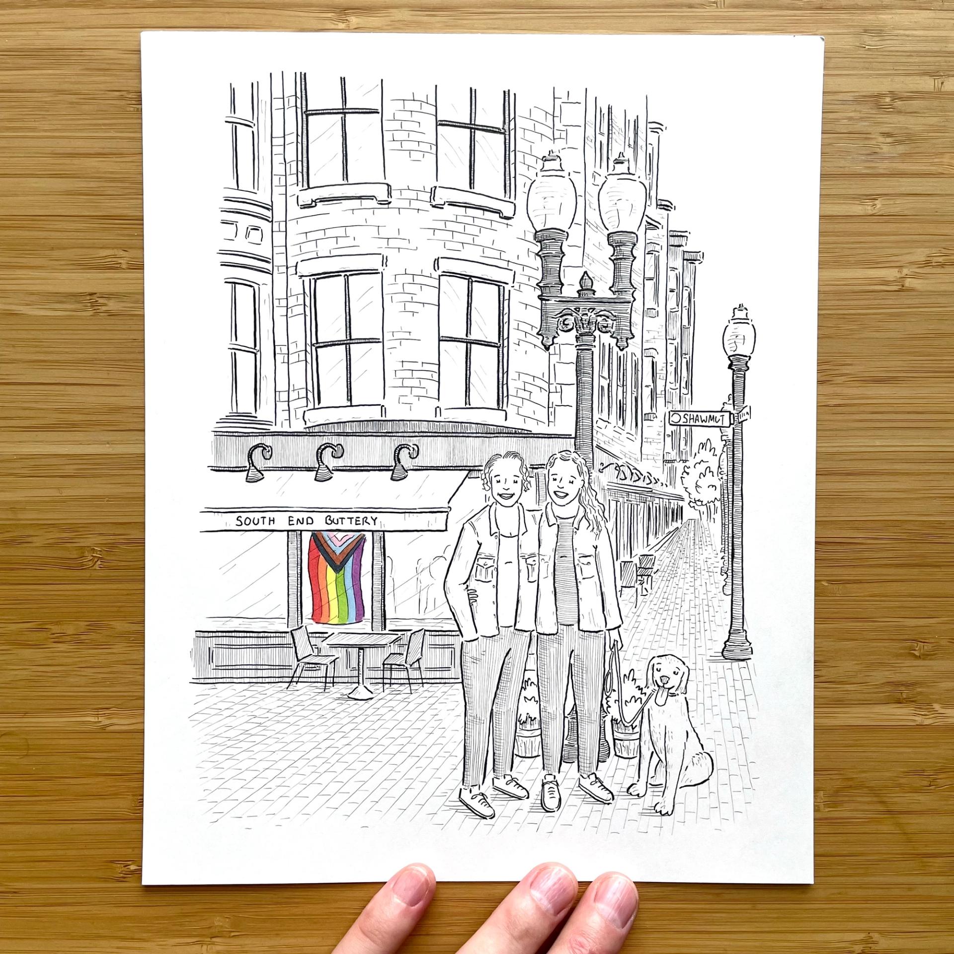 Working primarily in ink with splashes of colour, I capture places and moments with whimsy and narrative depth, often highlighting queer spaces of connection and joy. Since 2015, I have drawn hundreds of custom illustrations for people and sold artwork through my online shop.