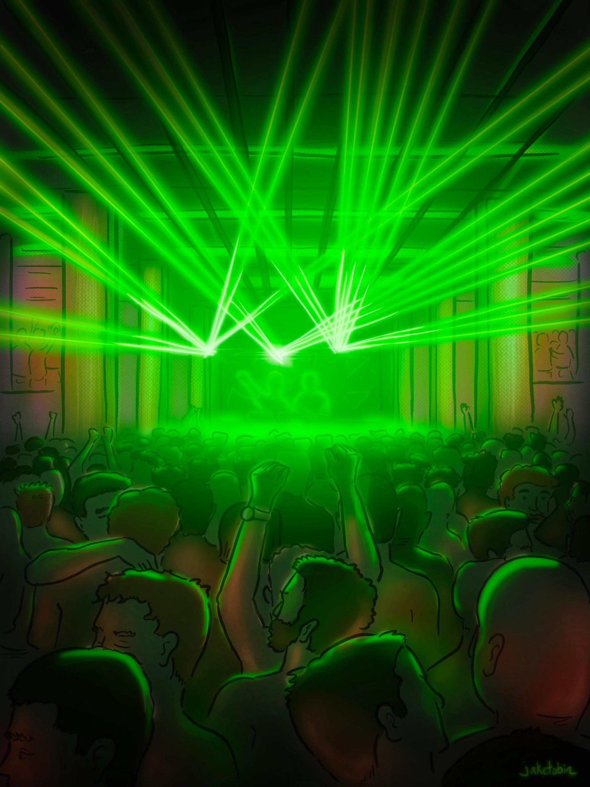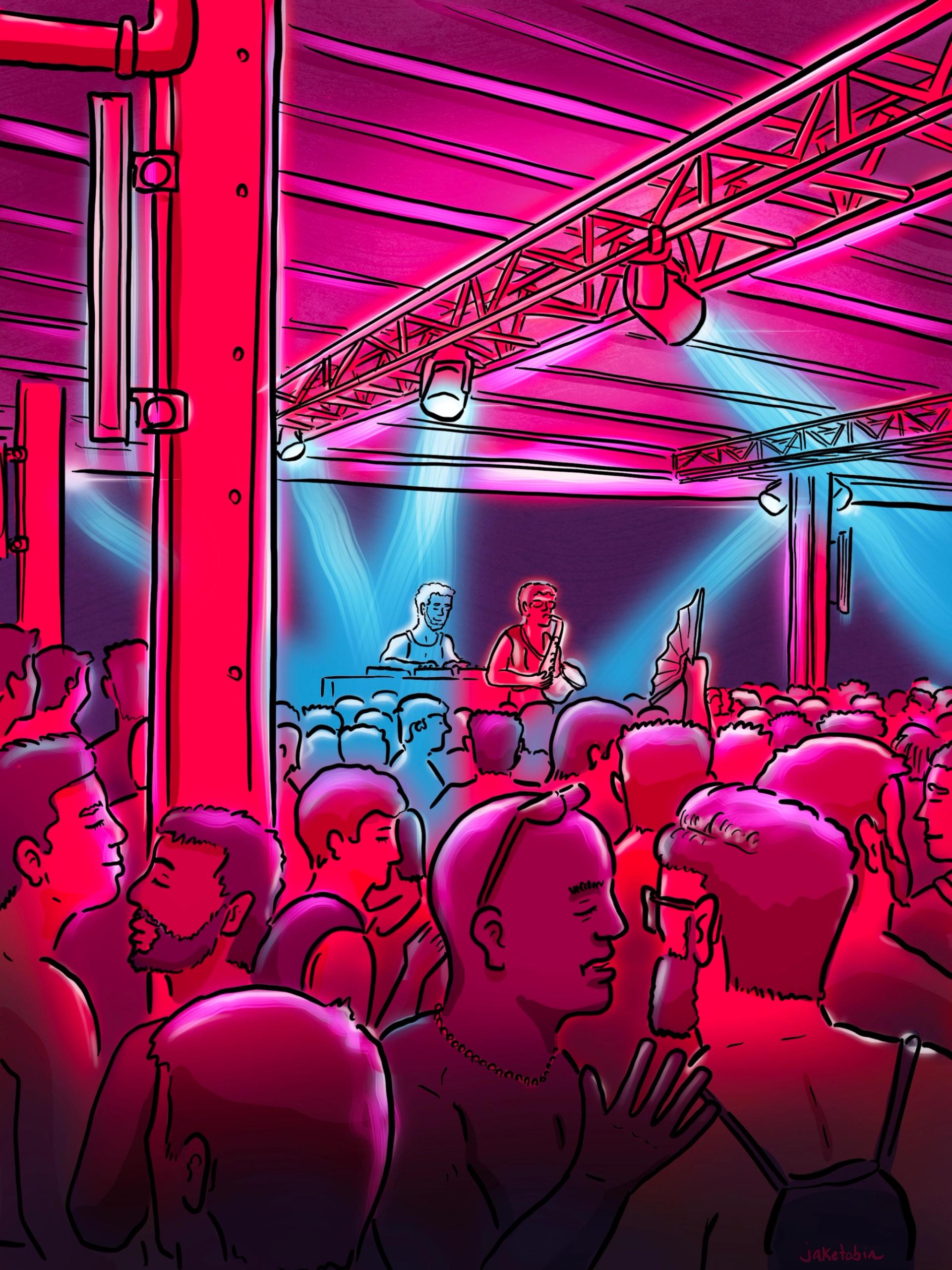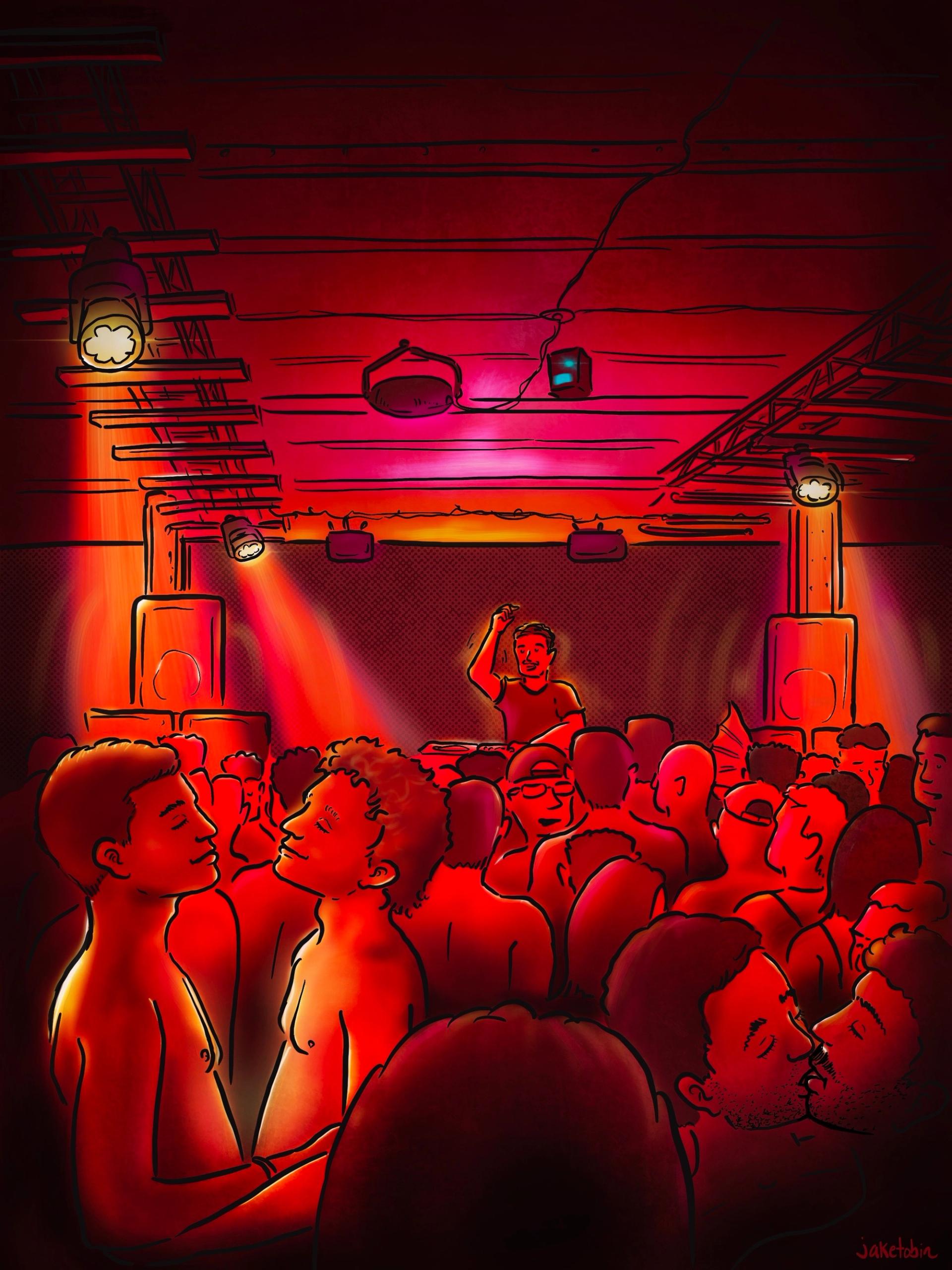 A series of illustrations featuring DJ scenes from queer parties, including Therapy, Bunker, and Precious Cargo in Toronto. 2025.