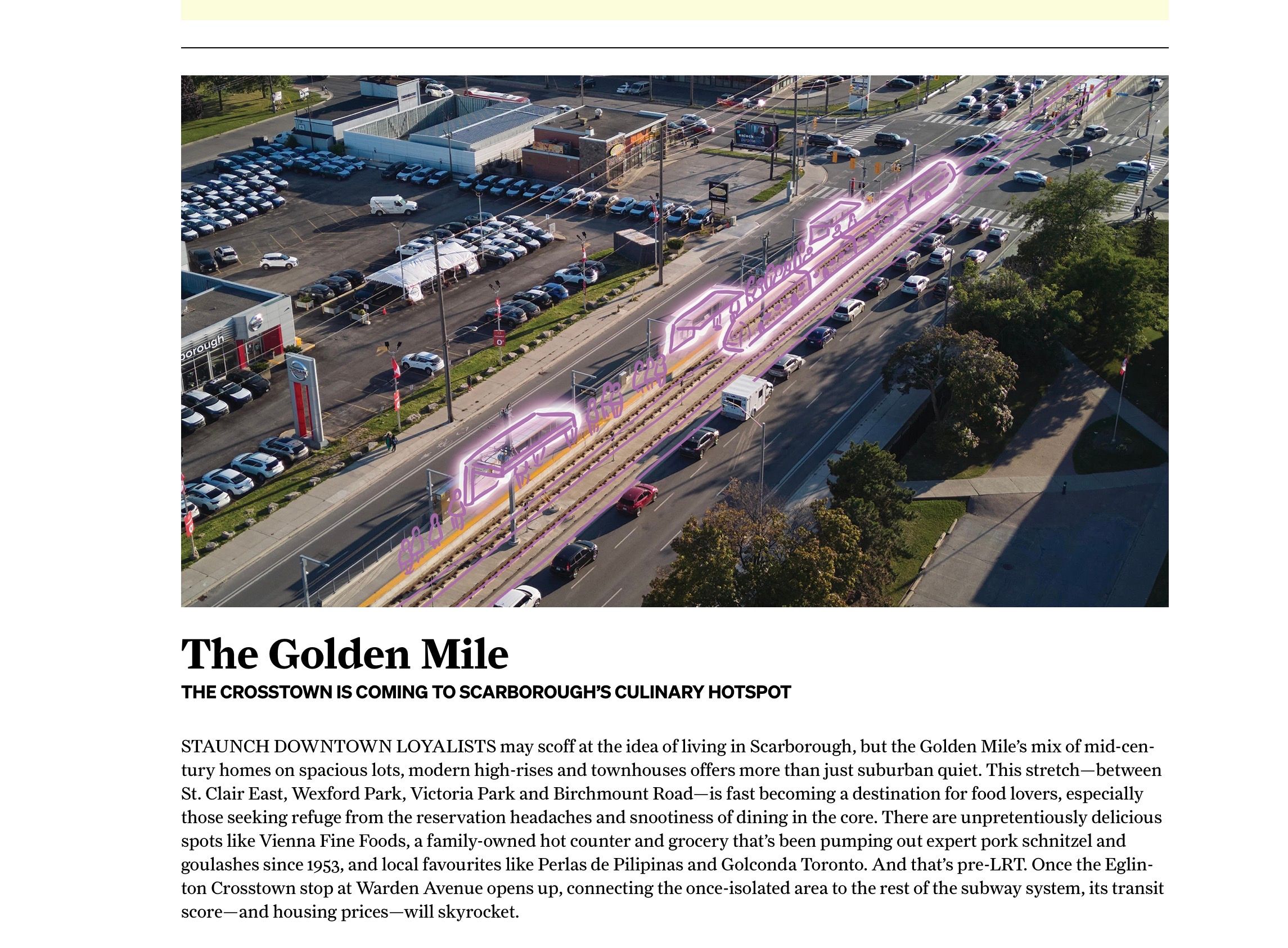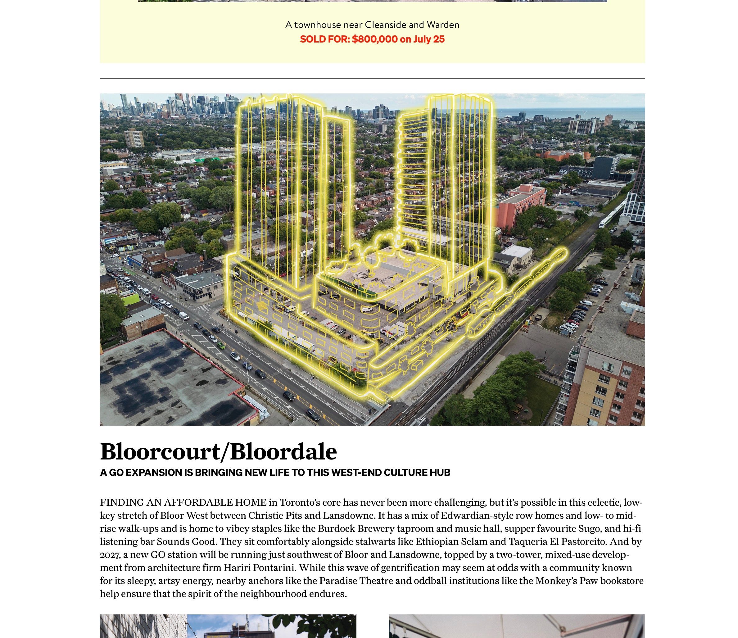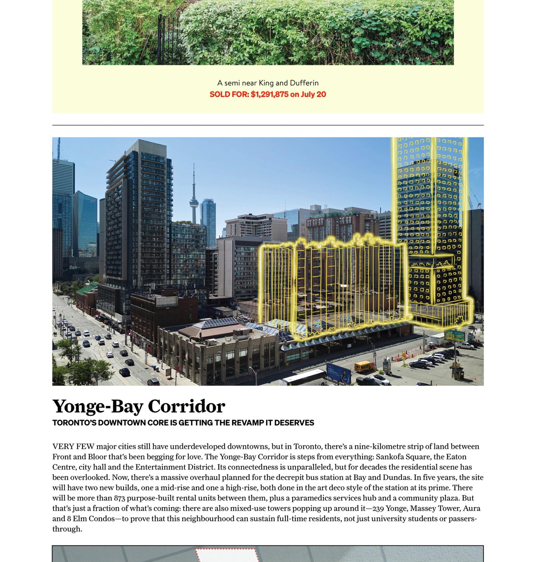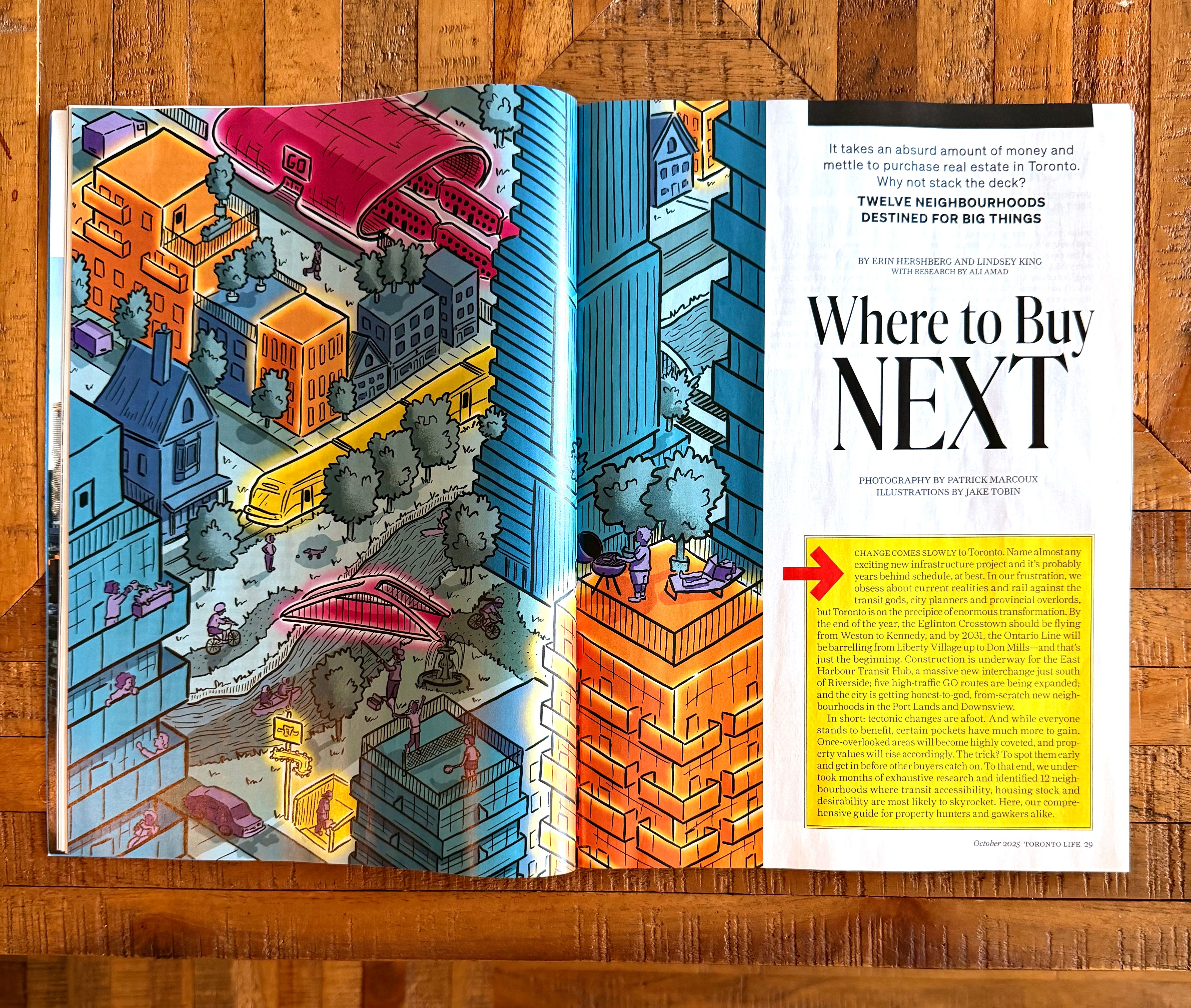 Full page illustration as well as 12 spot illustrations overlaid on photographs to show new developments in Toronto. Brief was to create a fantasy mash-up neighbourhood that included new transit stations, parks, high-rises, and sixplexes. Art Director: Colleen Nicholson. October 2025.