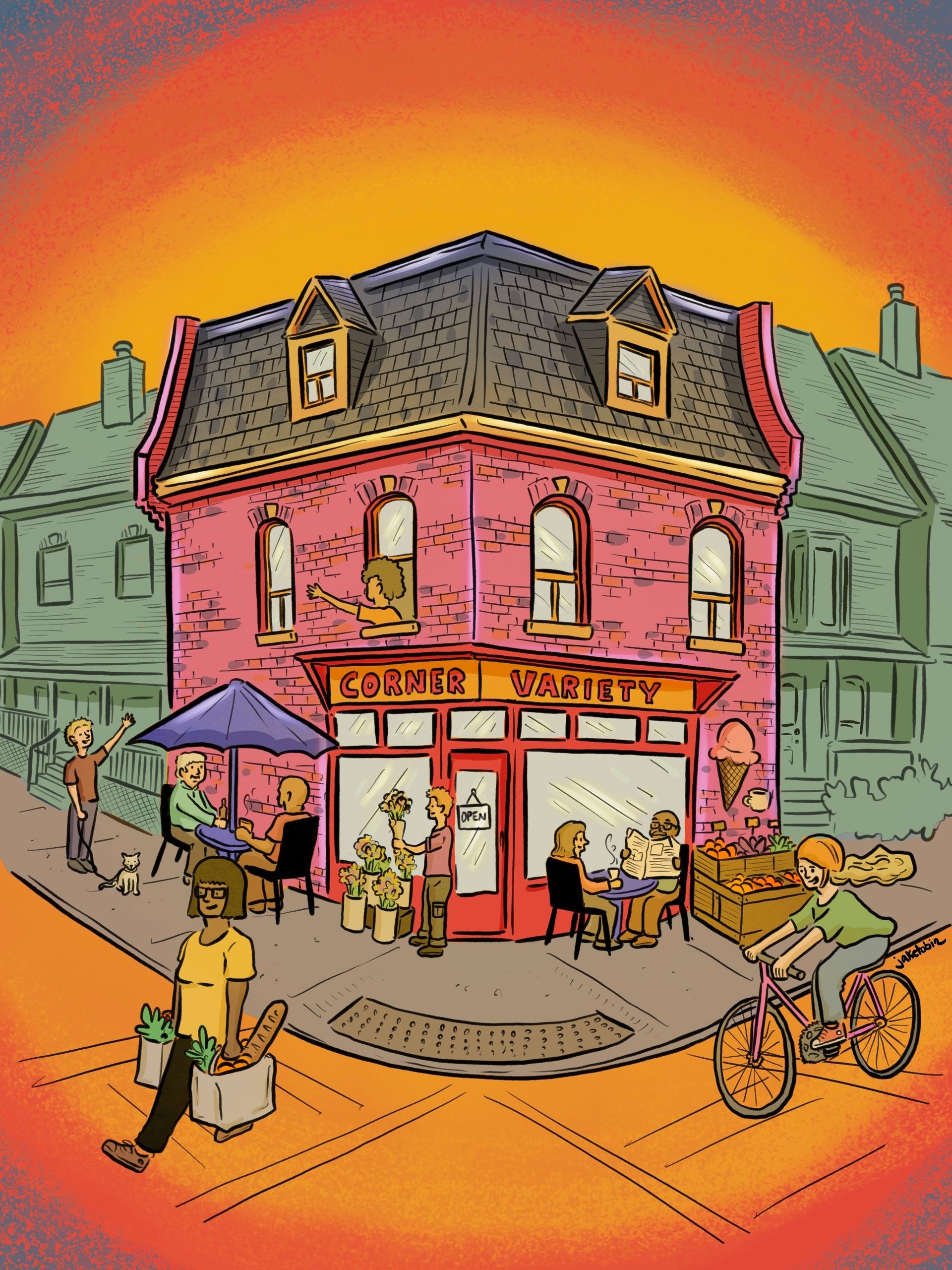 An illustration drawn to promote the idea of corner stores in residential neighbourhoods during a moment when the City of Toronto was considering legalizing small-scale retail and services within neighbourhoods. 2025.