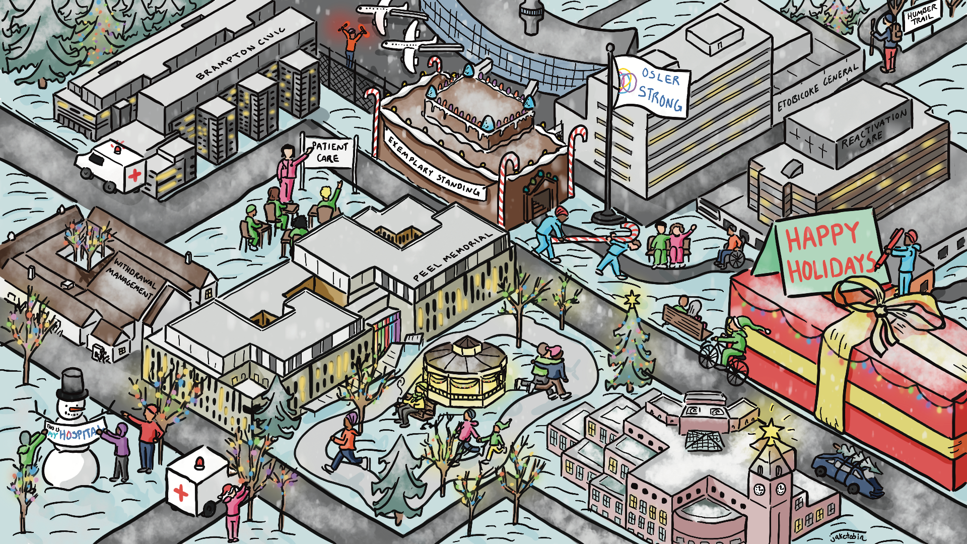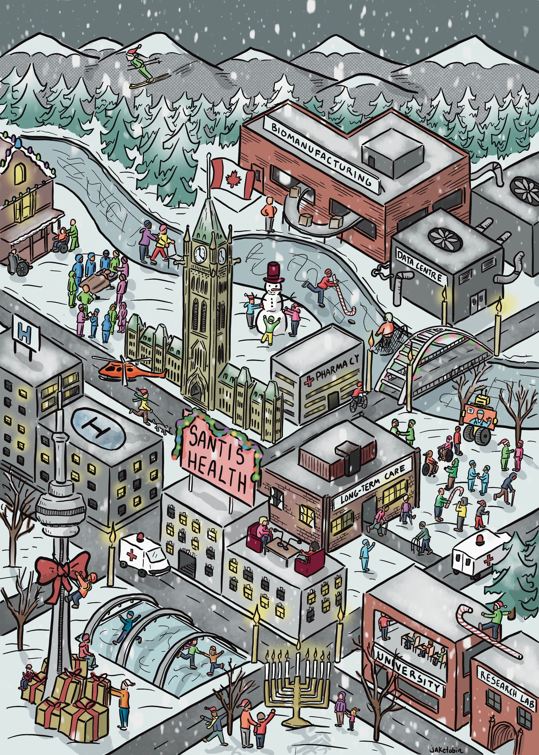 Custom holiday cards for Santis Health (2024 & 2025), Osler Health (2025), and the Lieutenant Governor of Ontario (2025).
