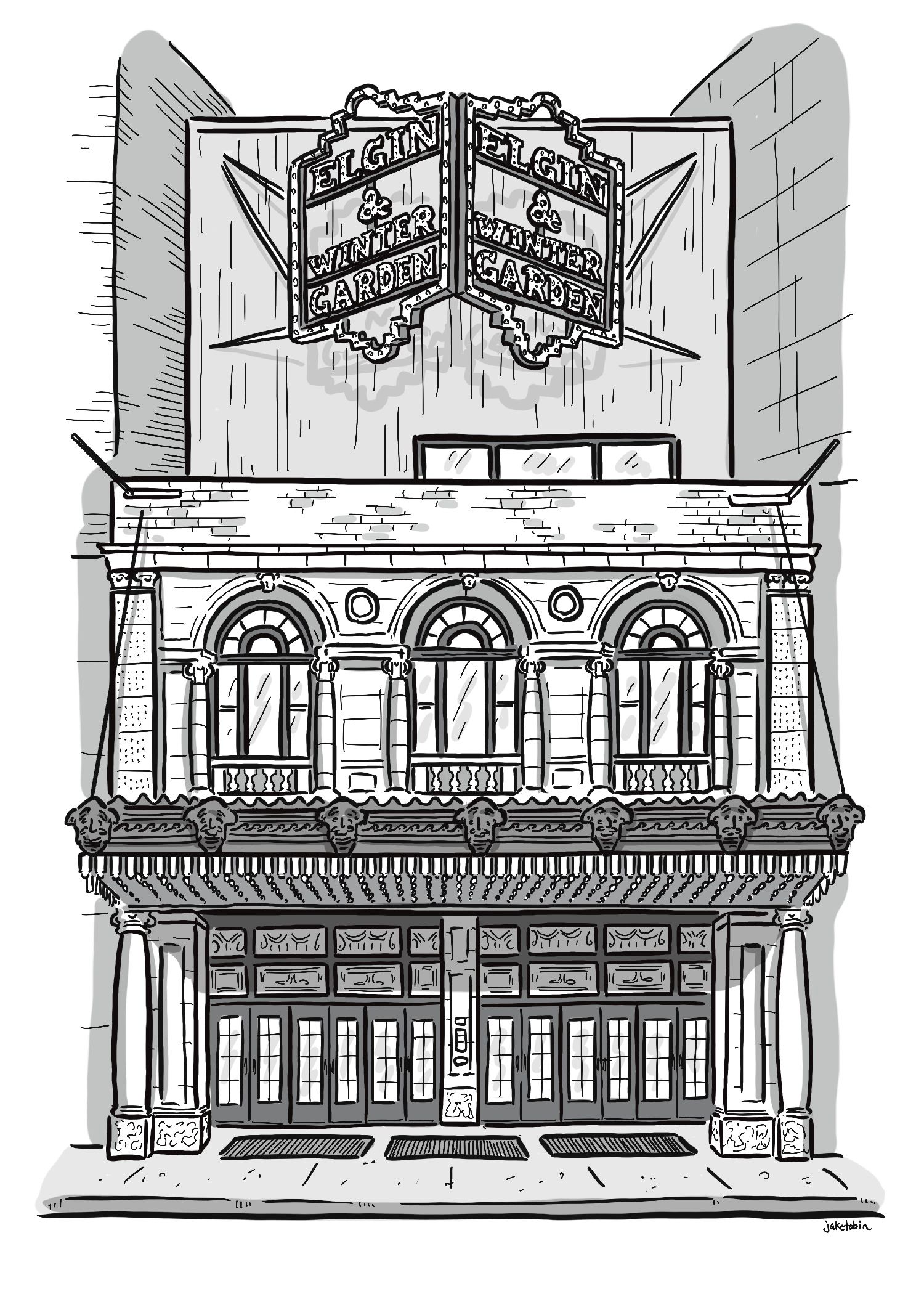 An illustration of the front of the theatre for use on tote bags and cards sold in the theatre gift shop. 2025.