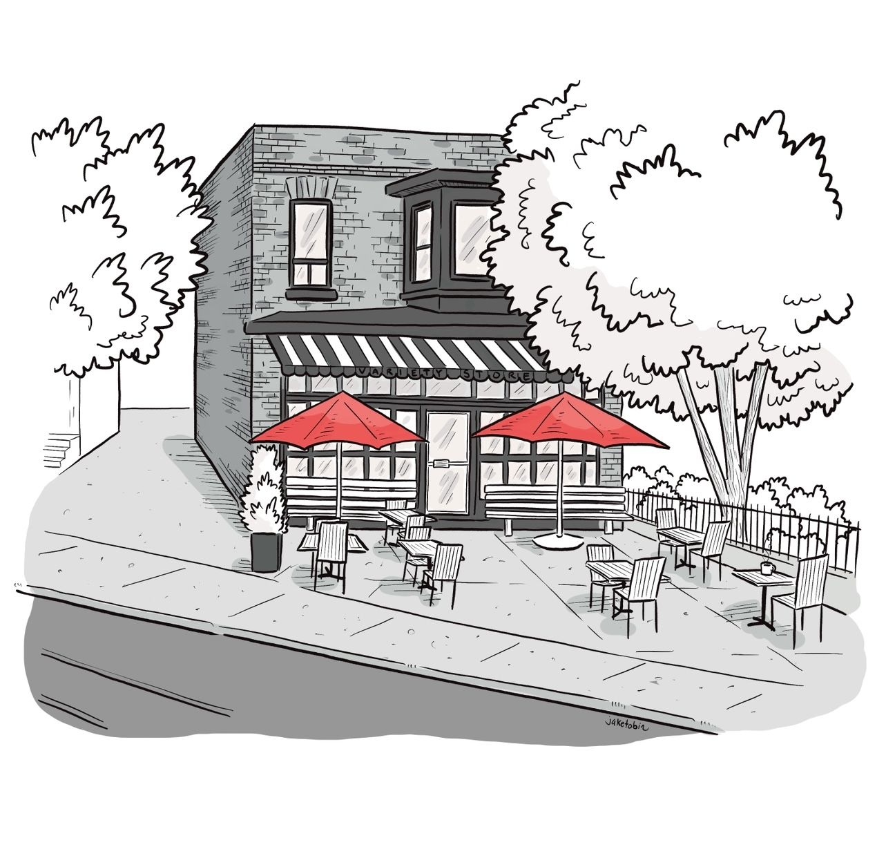 A selection of storefront illustrations, including an illustration commissioned by Mosaic Books in Kelowna, 2024. These were done as primarily greyscale with pops of colour to highlight certain elements.