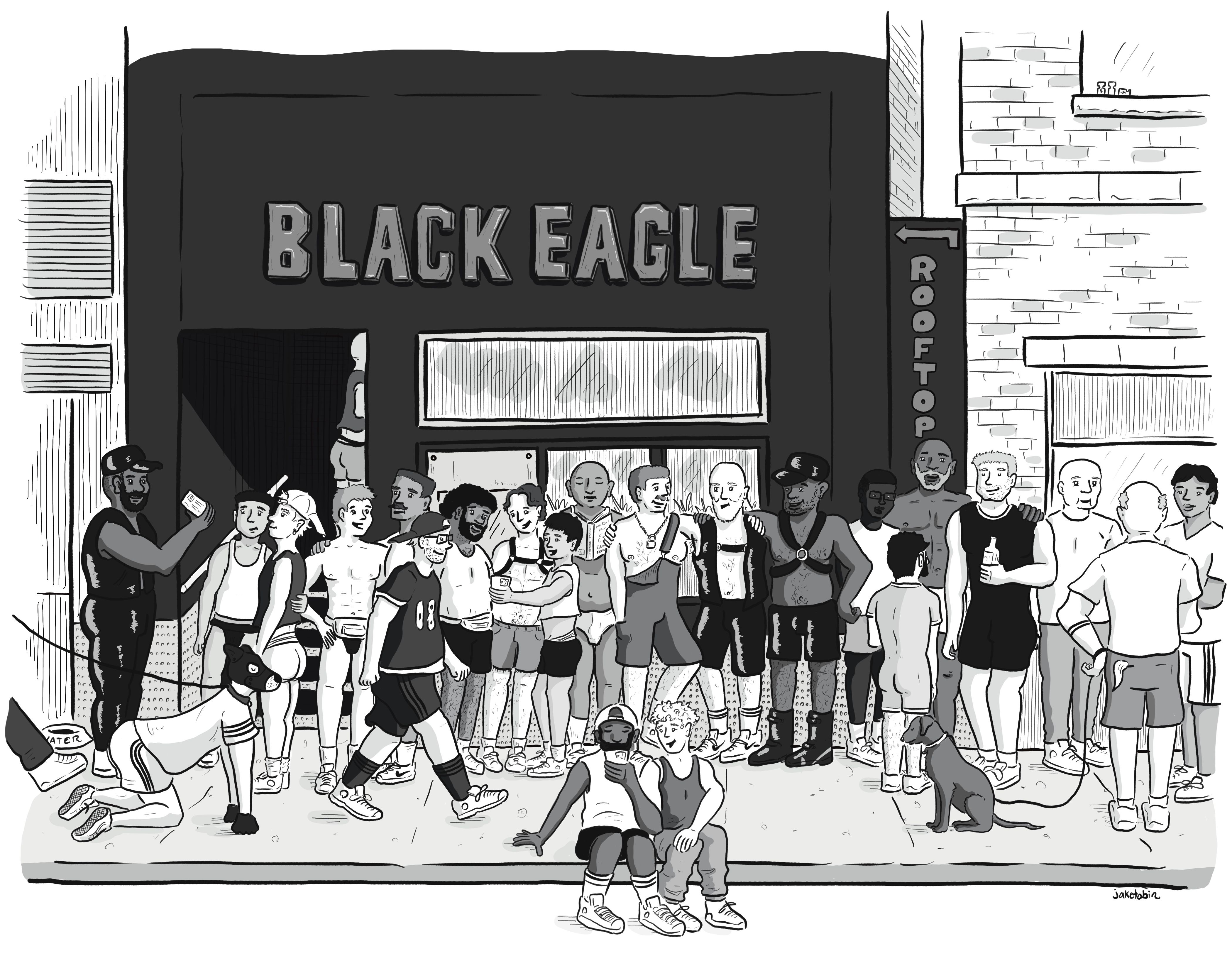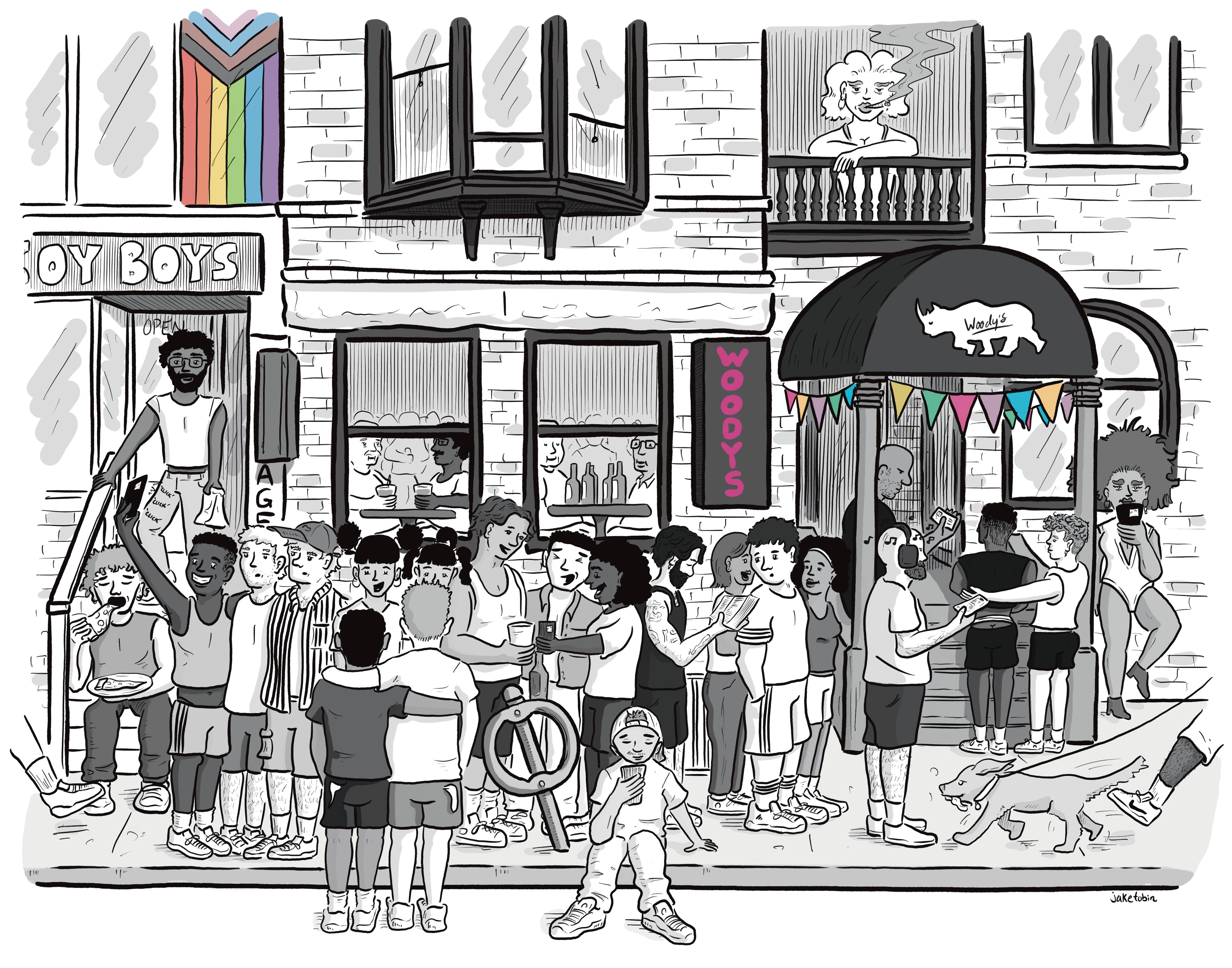 Two illustrations I drew as prints for Pride 2025 that showcase the line-ups for two popular gay bars in Toronto: Woody's and Black Eagle.