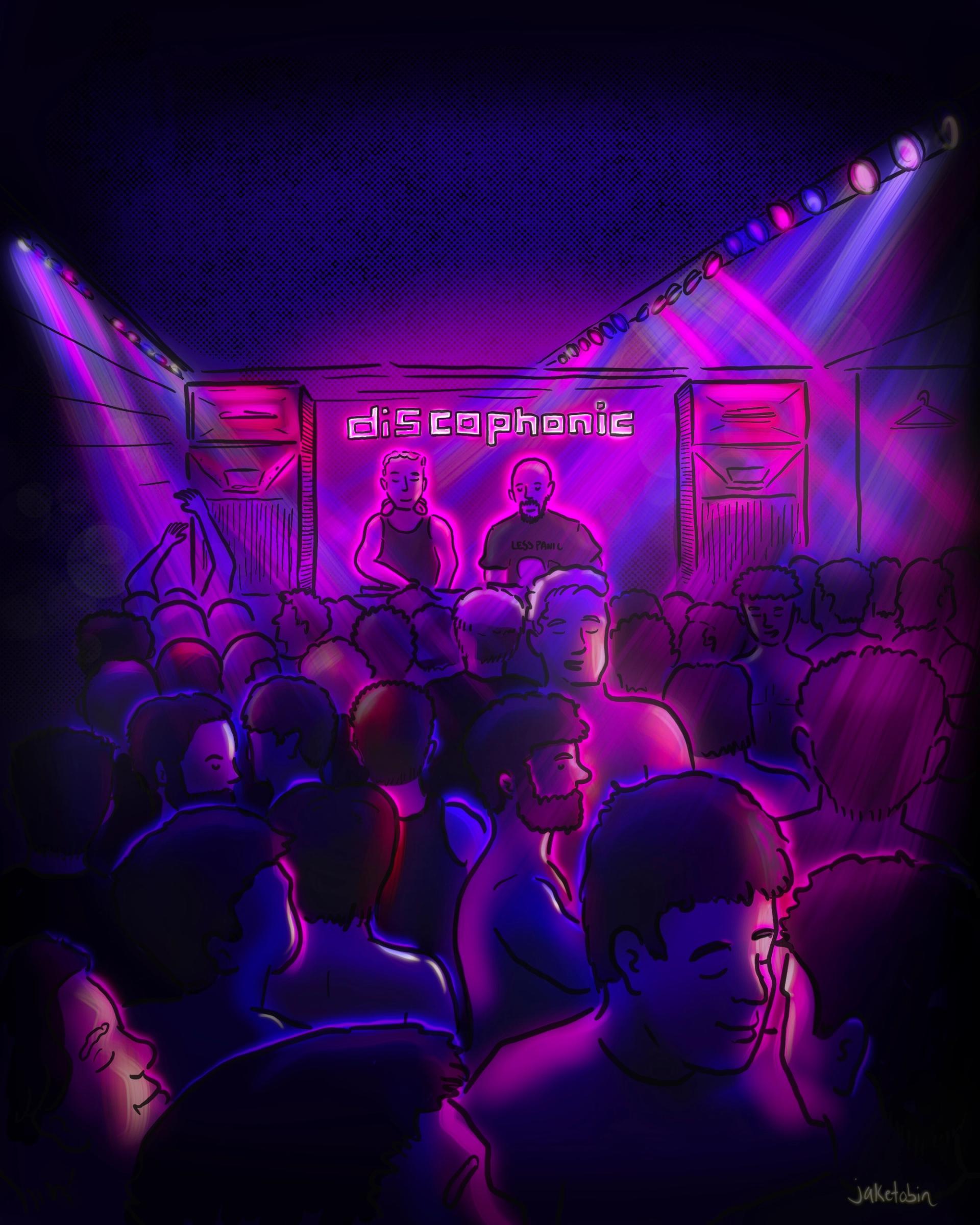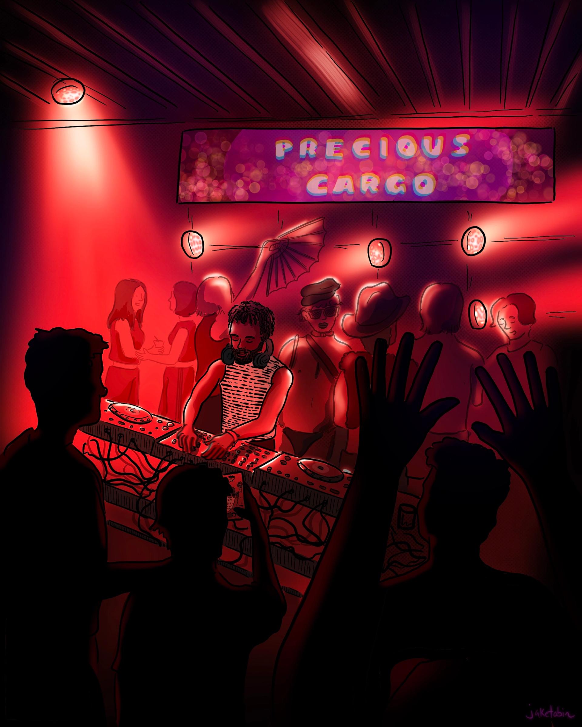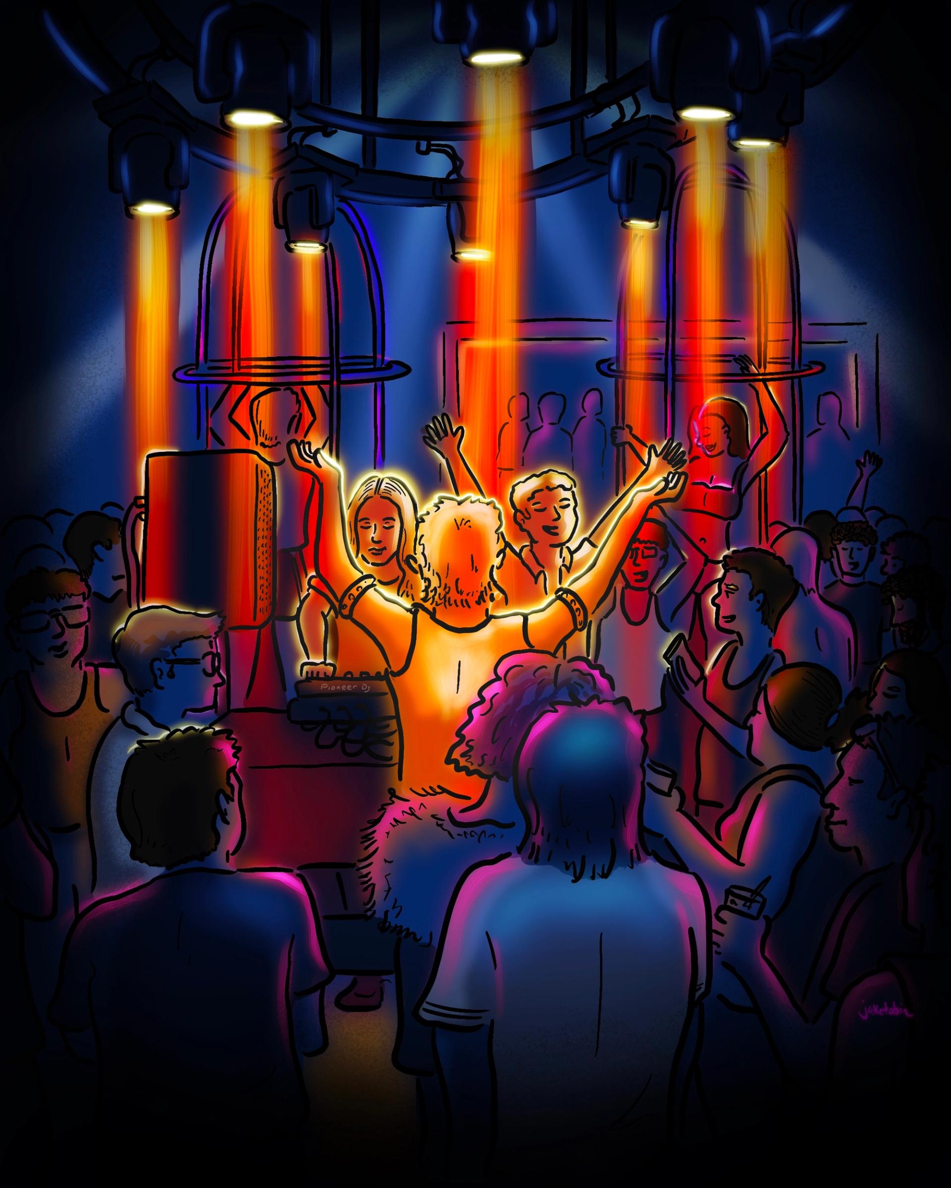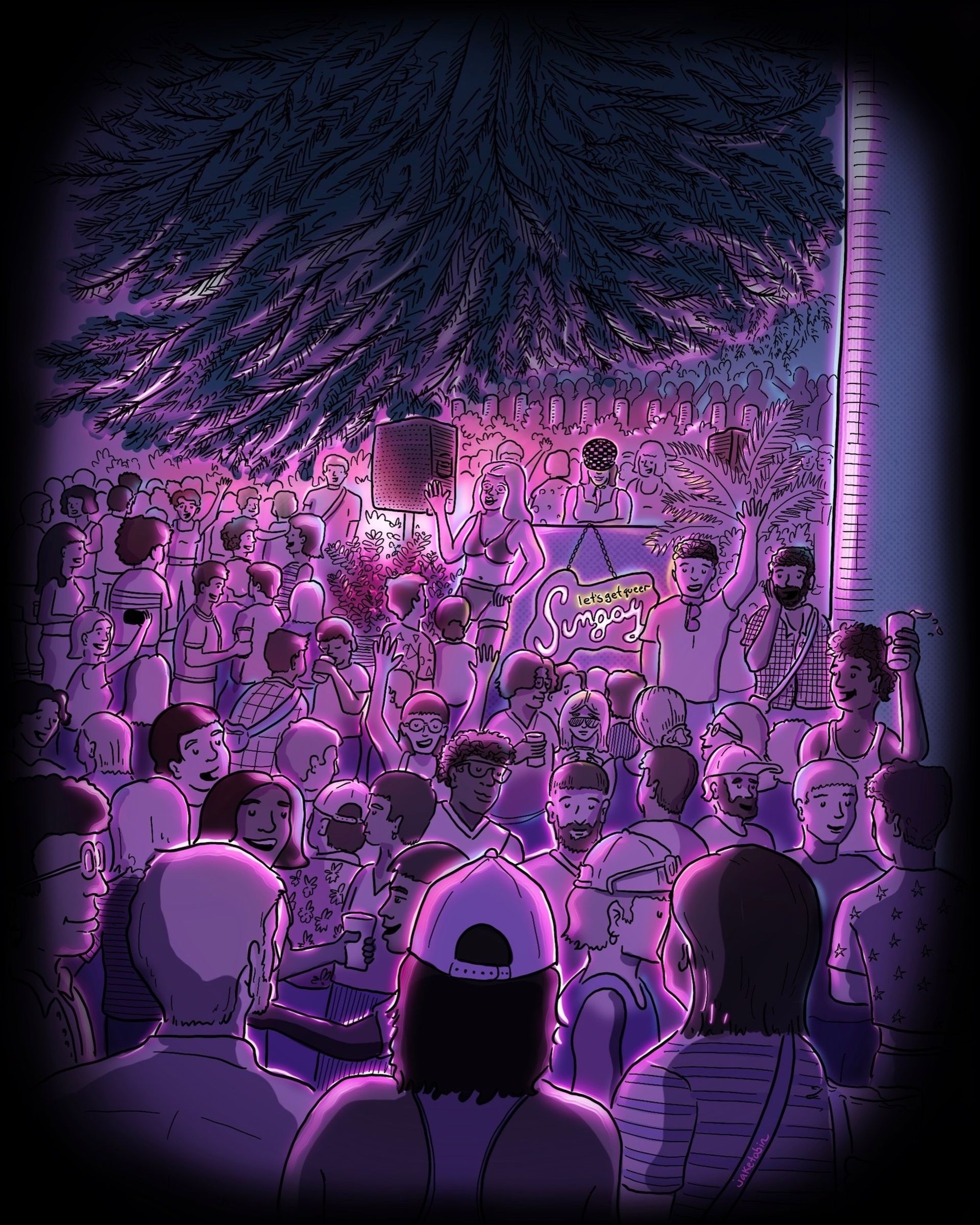 A series of illustrations featuring scenes from queer parties in Toronto and Mexico City.