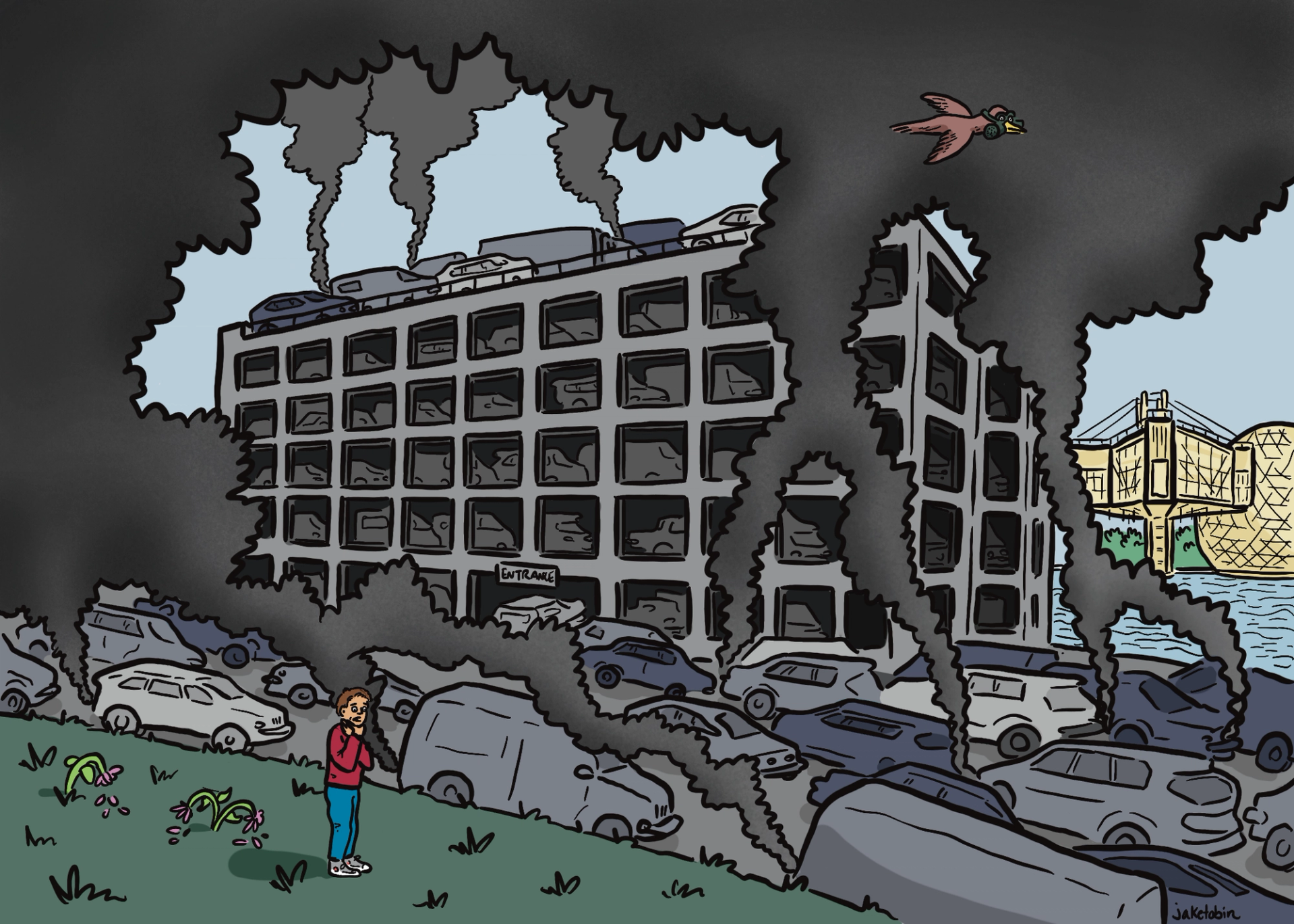 Illustration for Ontario Place For All for their campaign against a multi-level parking garage the Provincial government is building at Ontario Place. 2024.