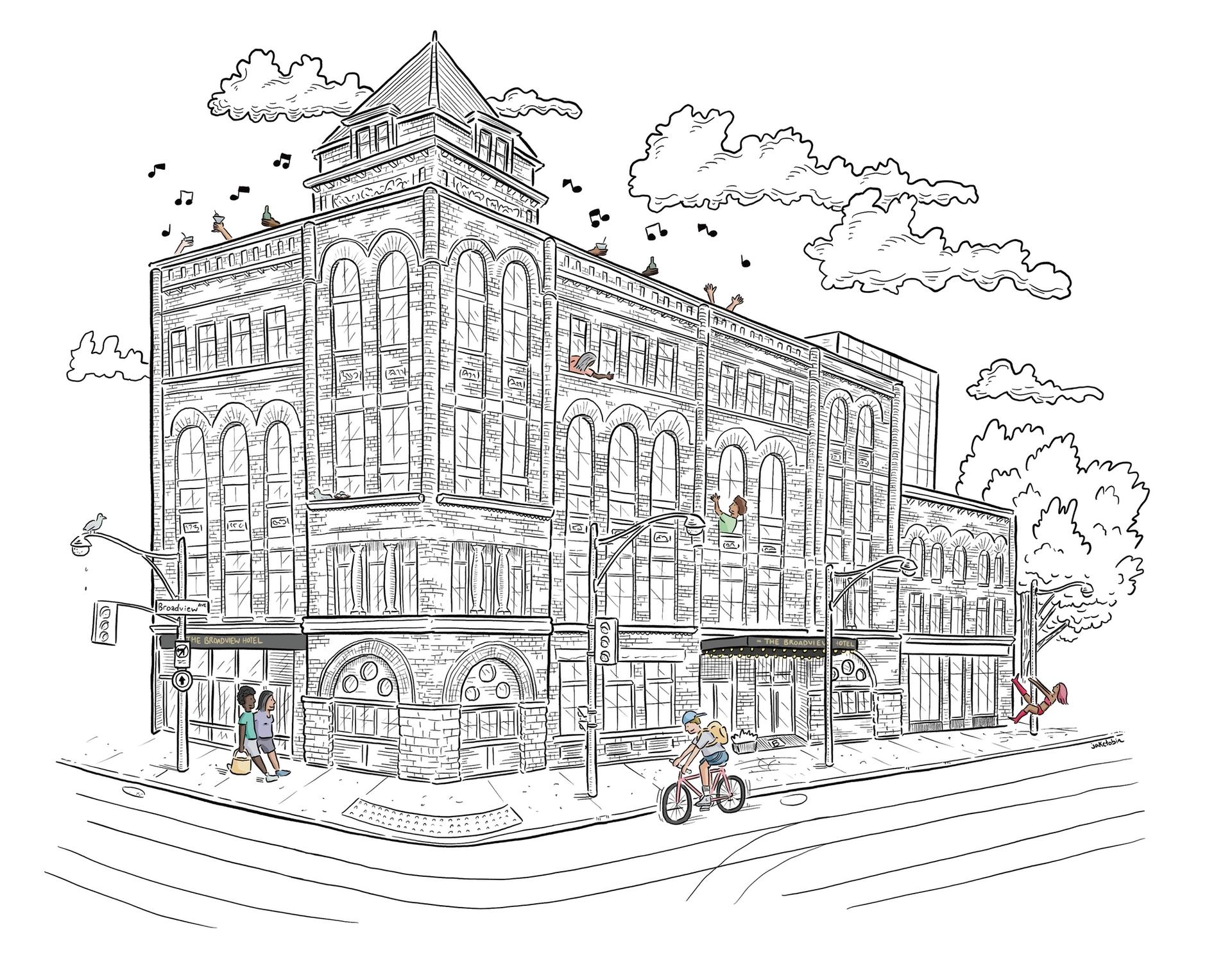 Long a staple of Toronto’s Riverside neighbourhood, the Broadview Hotel has gone through many iterations. This cartoon portrays it in its current form as the trendy bar and hotel complete with rooftop patio, but also contains a little homage to its previous incarnation as Jilly’s strip club.