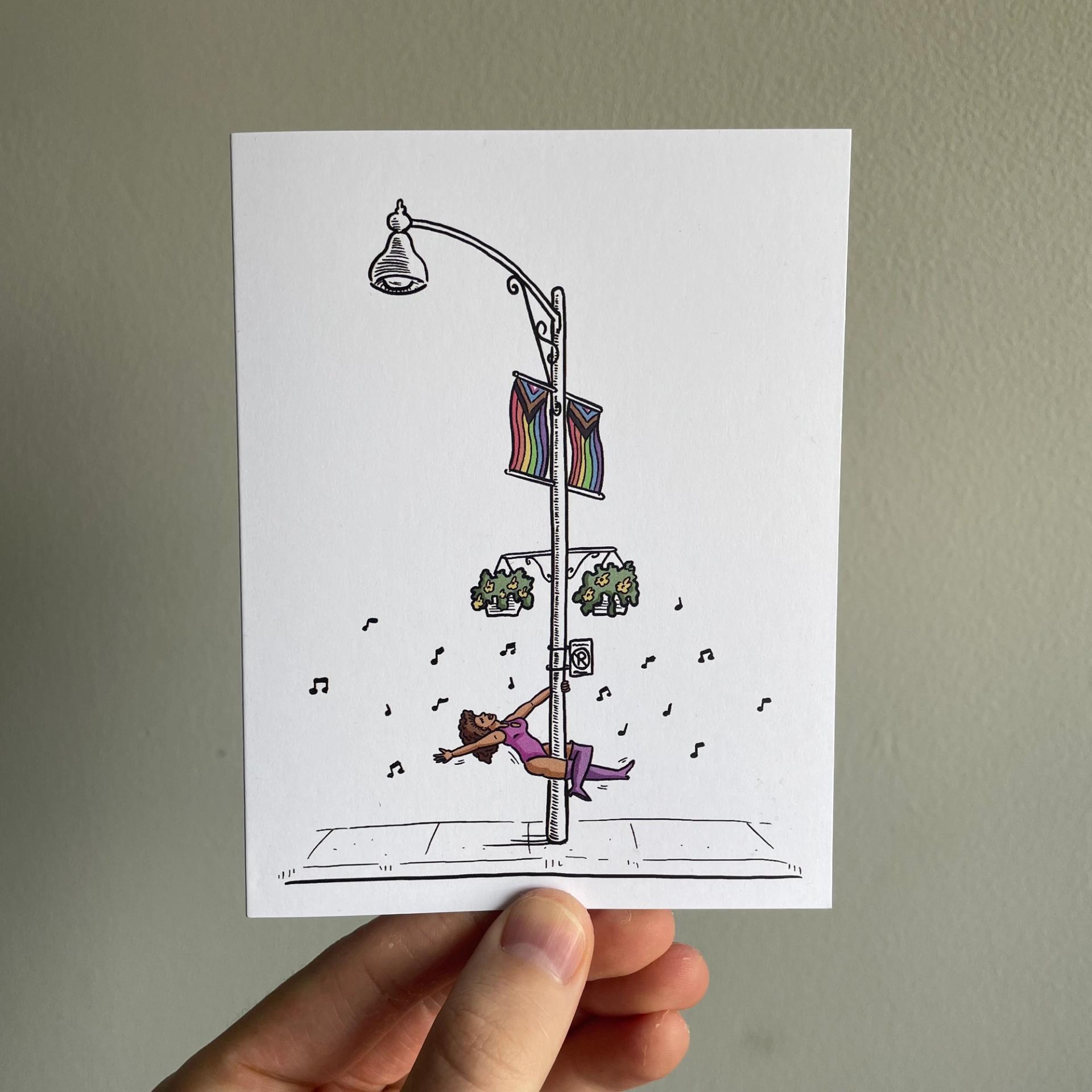 Send a note to someone special with this greeting card featuring a drag queen living it up out on the street. Includes white envelope.