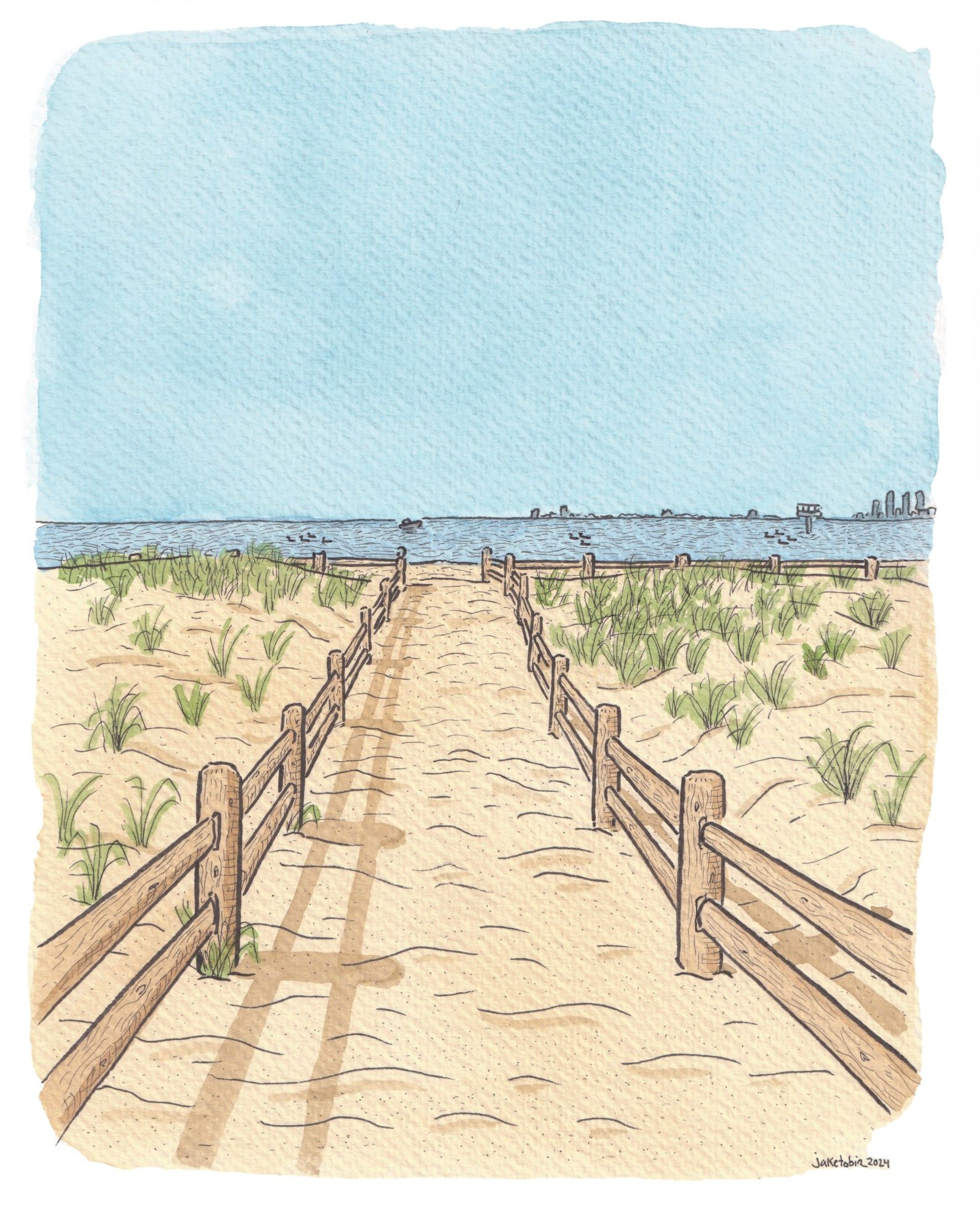 Part of a Hanlan’s Beach Coming/Going duo of the way into and out of Hanlan’s Beach in Toronto. Original 8x10 ink and watercolour for sale, plus limited numbered 8x10 prints (35 copies).