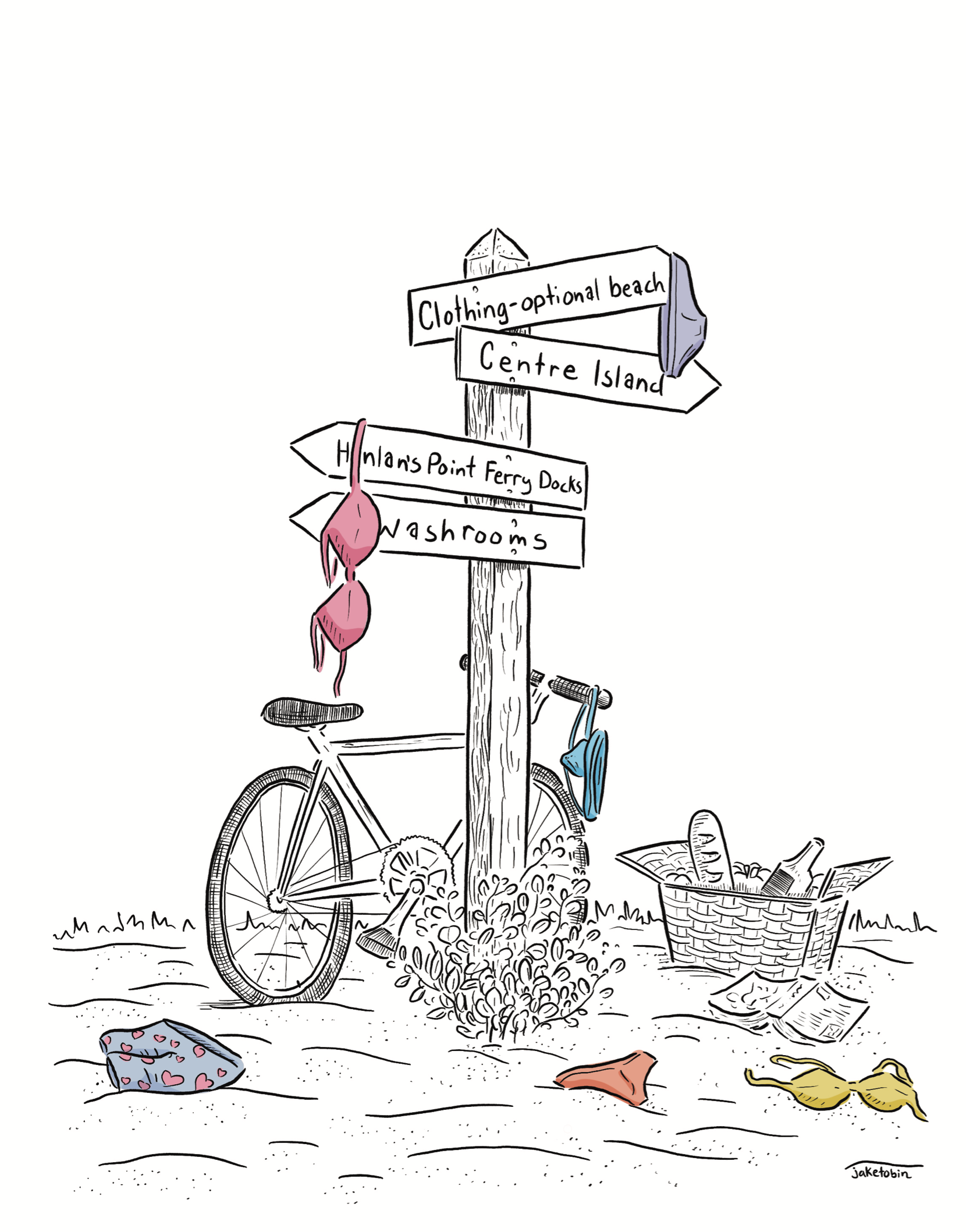 Part of a series of four Hanlan's Beach illustrations that celebrate Toronto’s historic nude beach and its legacy as a queer space. Anchored in signage found around the beach, each illustration is meant to elicit a cheeky "iykyk" vibe.