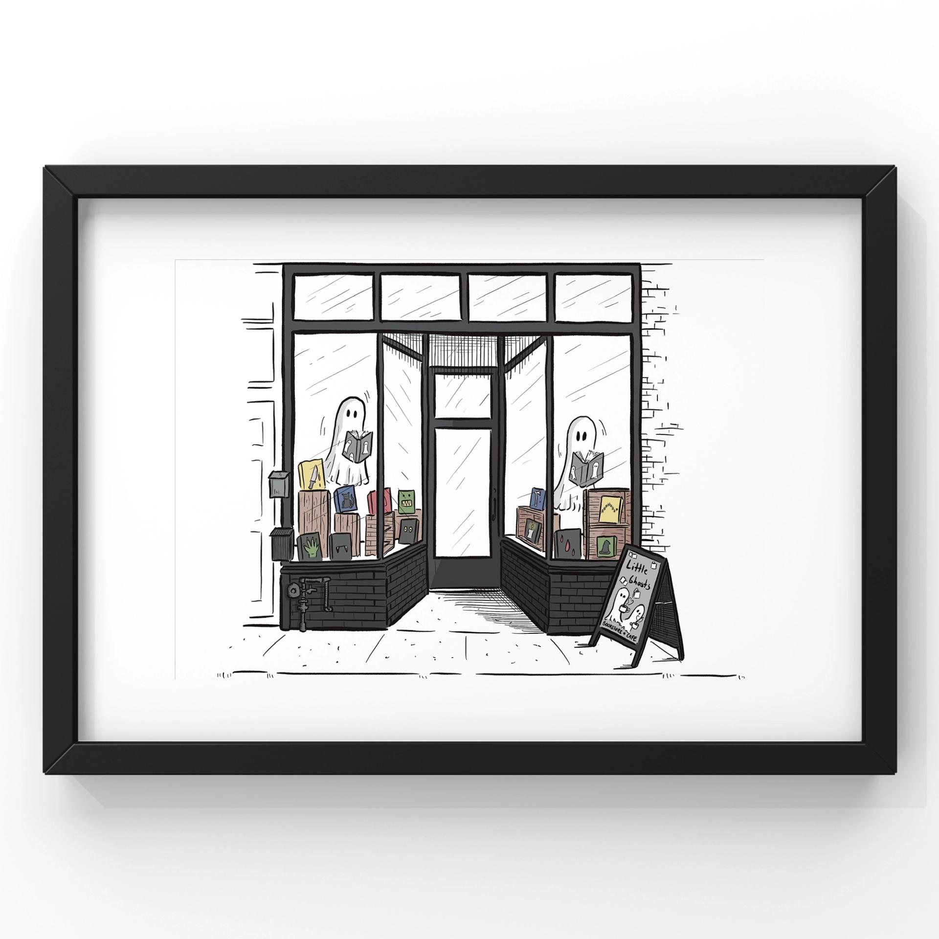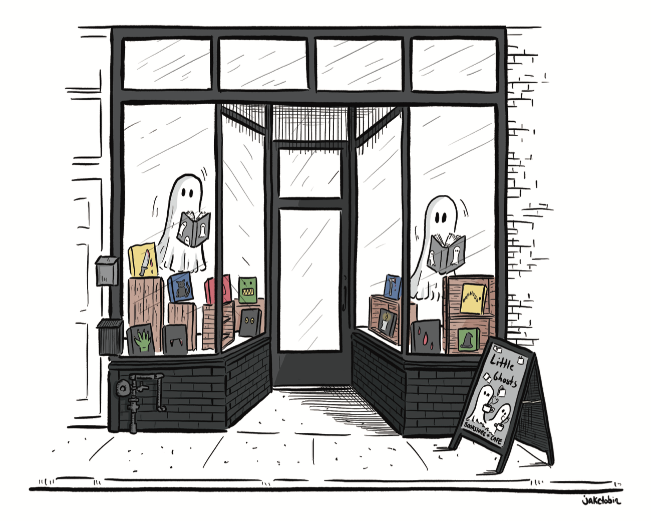 A whimsical take on the horror-themed bookstore and cafe Little Ghost in Toronto, ON. Part of a series of bookstore prints.
