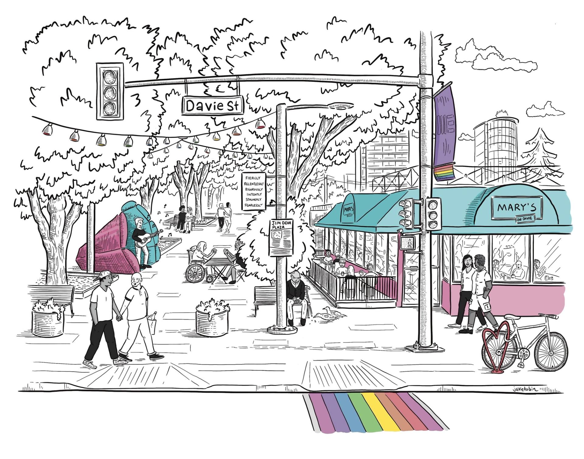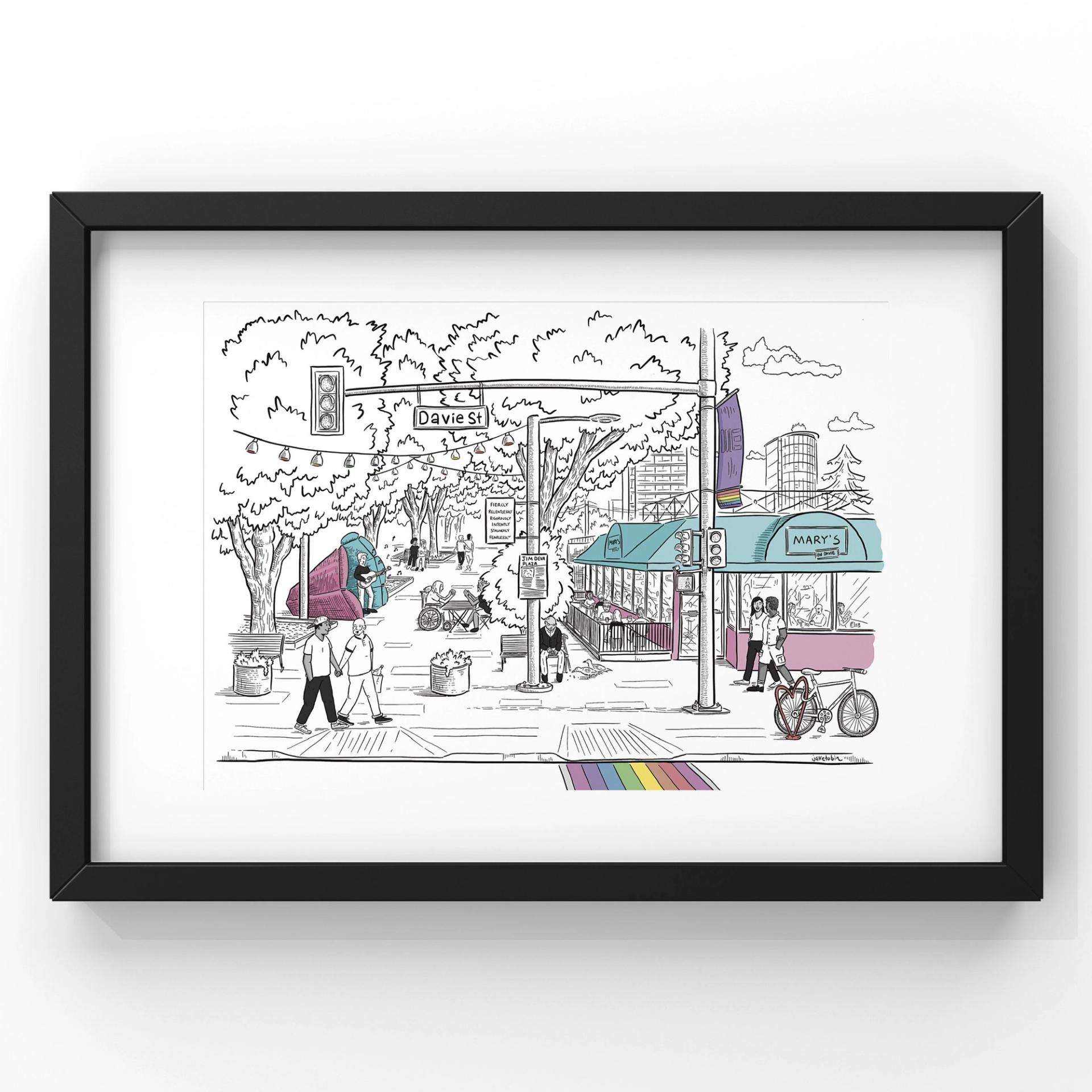 See and be seen at Jim Deva Plaza next to the iconic Mary’s diner in Vancouver’s Davie Village—and then bring the experience home with this print.