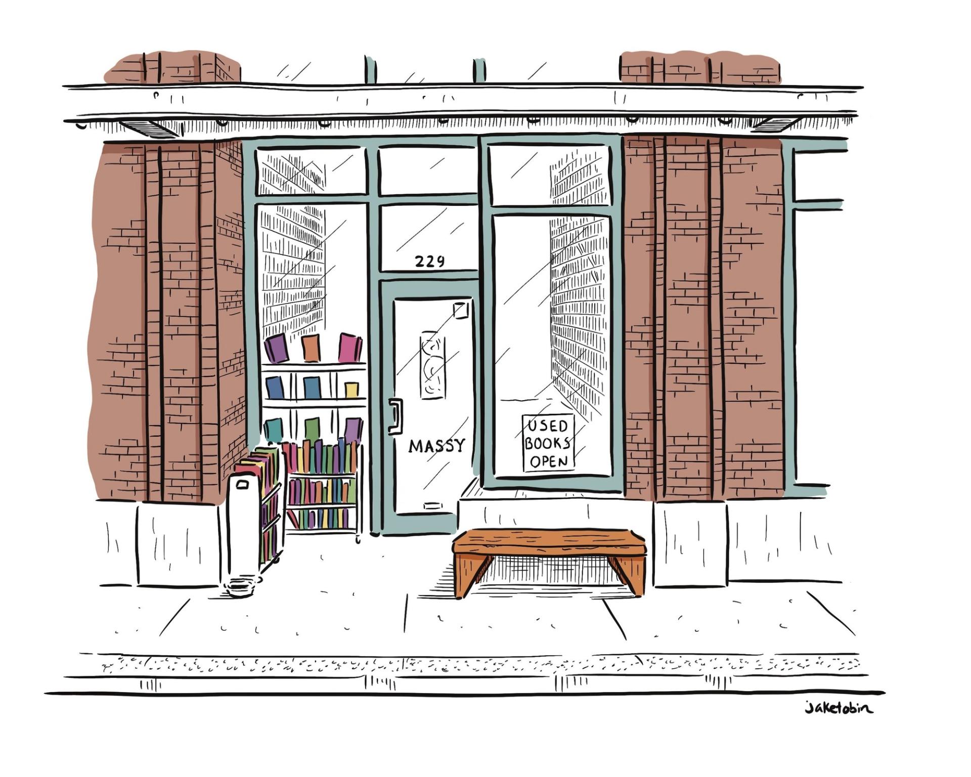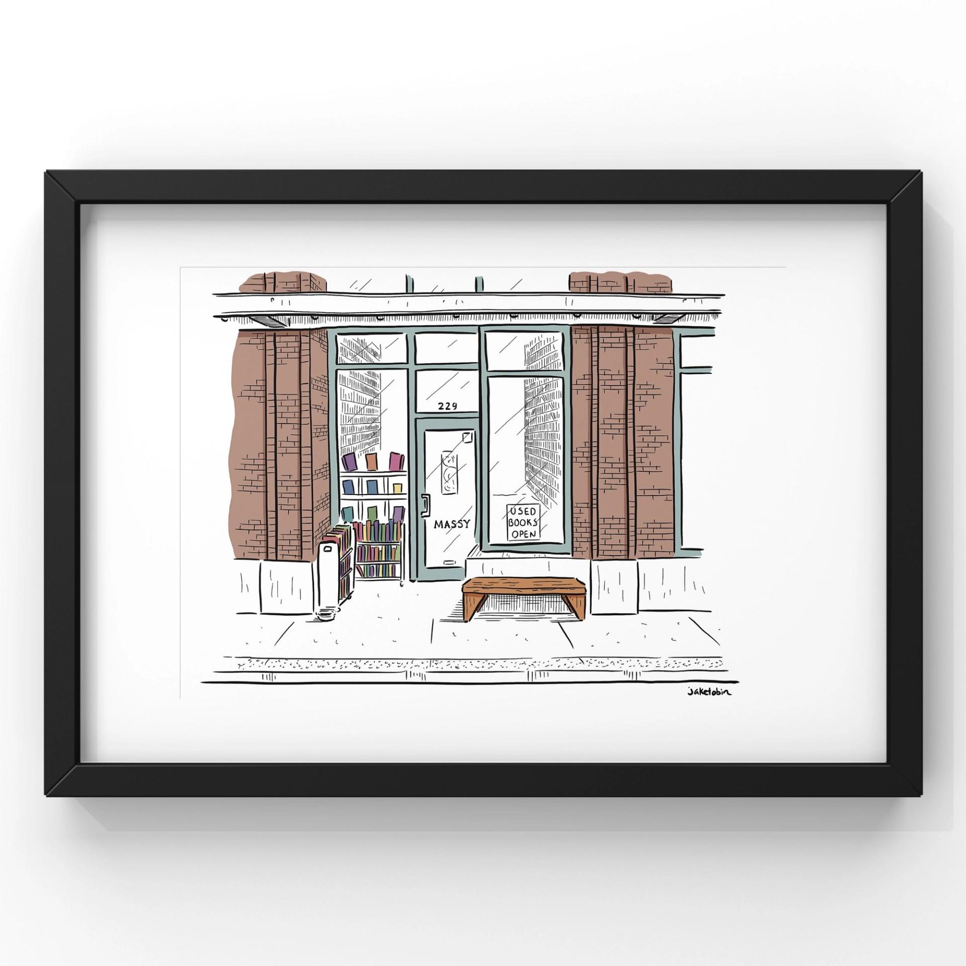A whimsical take on Massy Books in Vancouver, BC. Part of a series of bookstore prints.