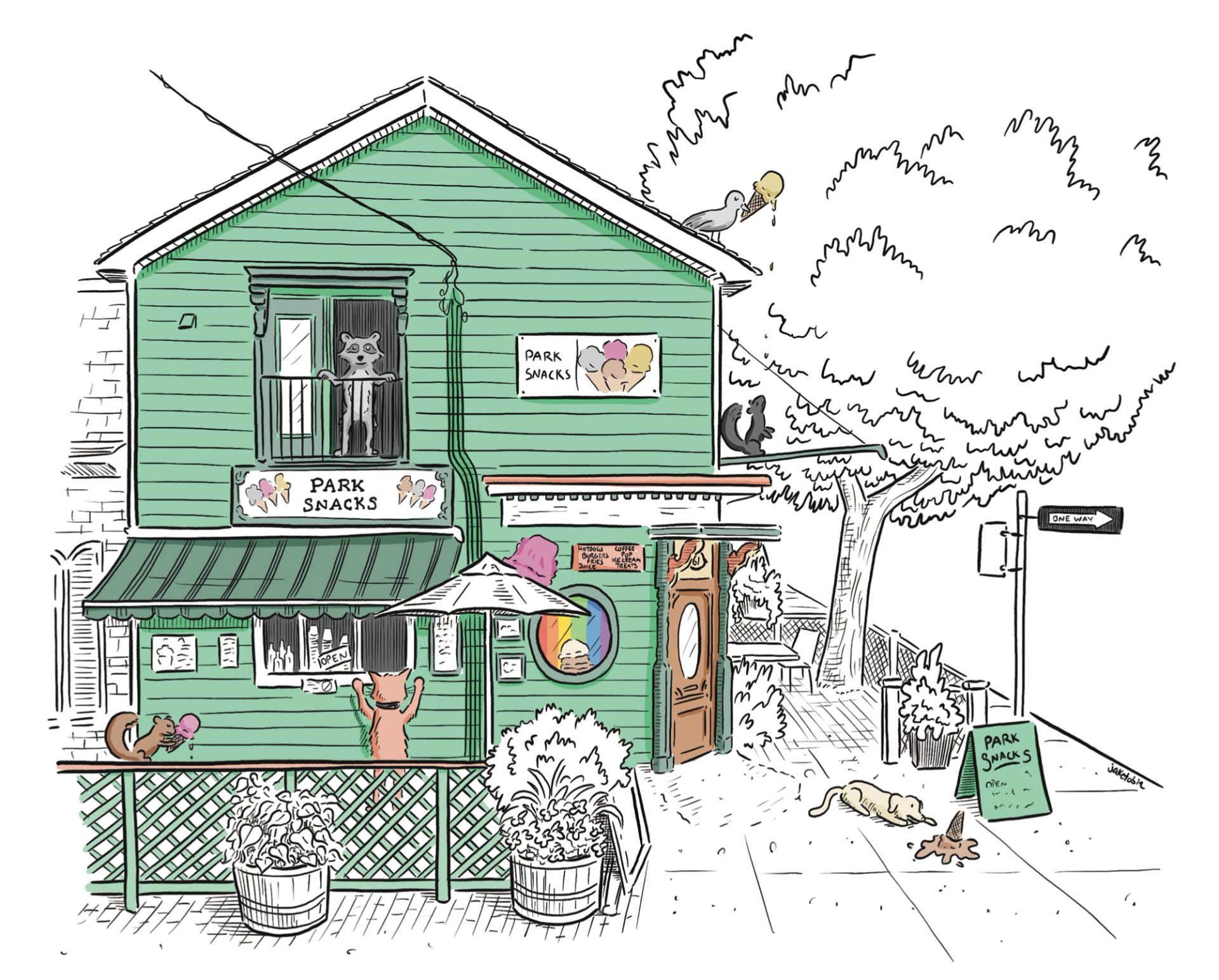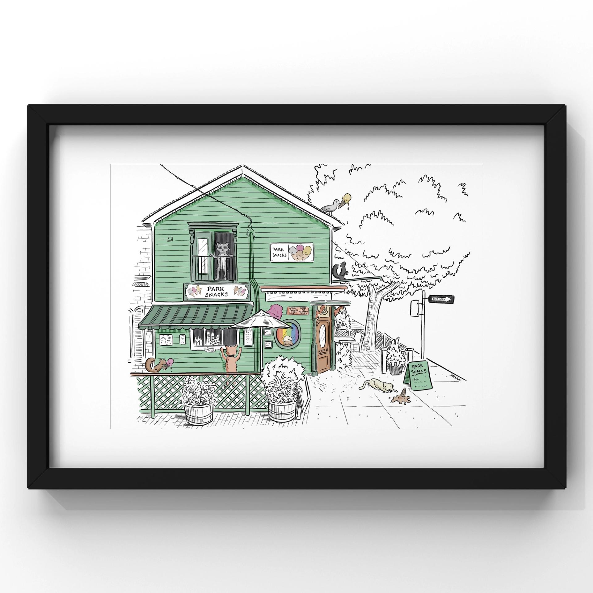 In September 2023, the building was put up for sale, so sadly Park Snacks days may be numbered. If you have $3 million lying around maybe you could buy it! If not, you can always grab this print instead.