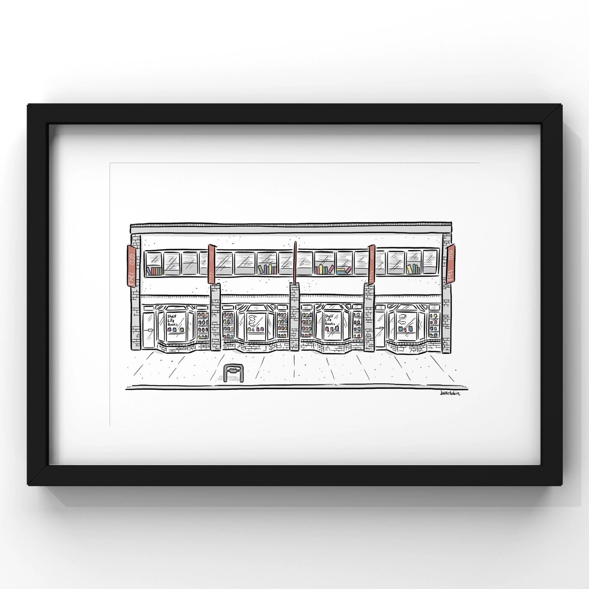 A whimsical take on Shelf Life Books in Calgary, AB. Part of a series of bookstore prints.