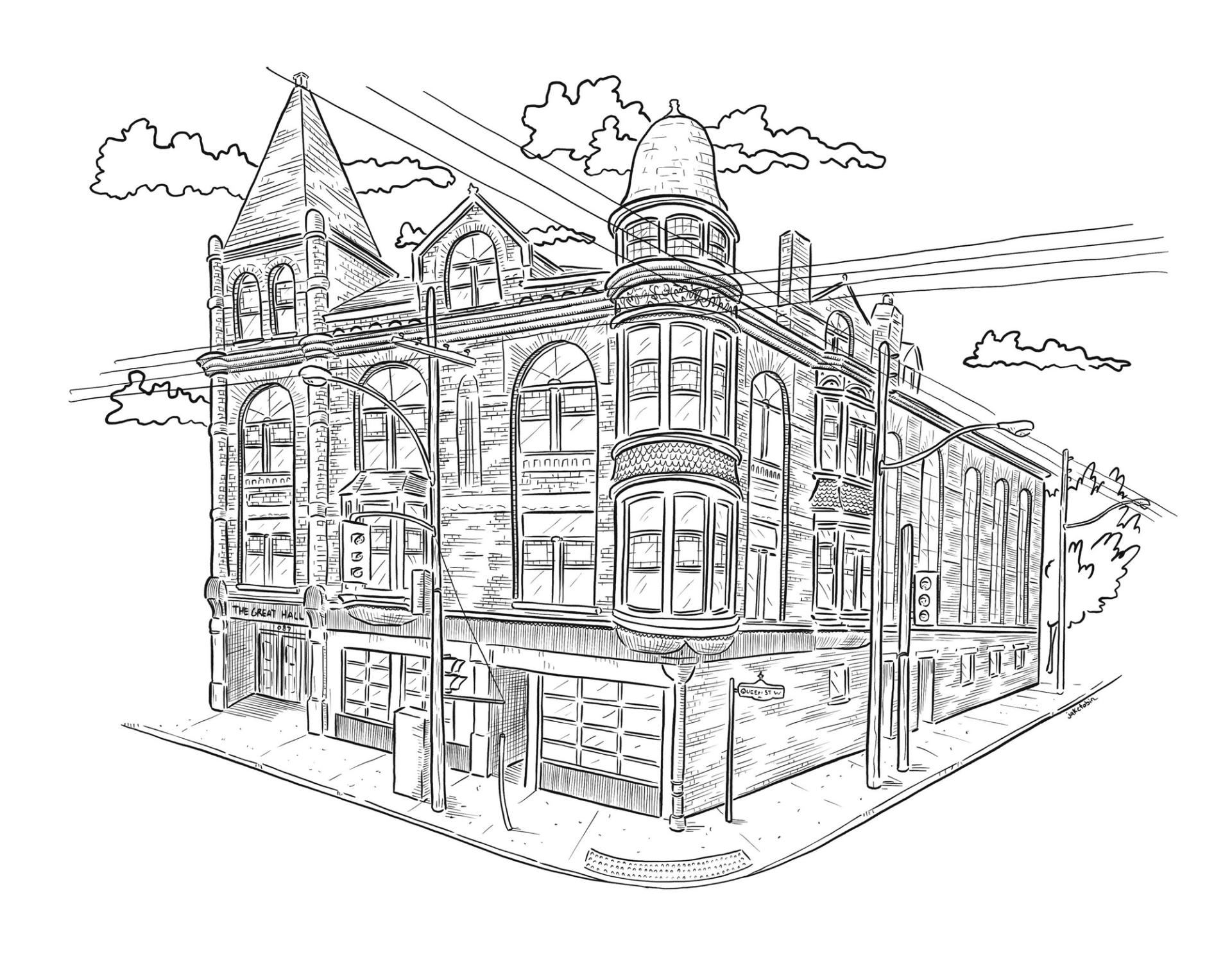 This illustration depicts one of the greats—halls, at least. Home to concerts, dance parties, community events, and more The Great Hall in Queen West has seen it all.