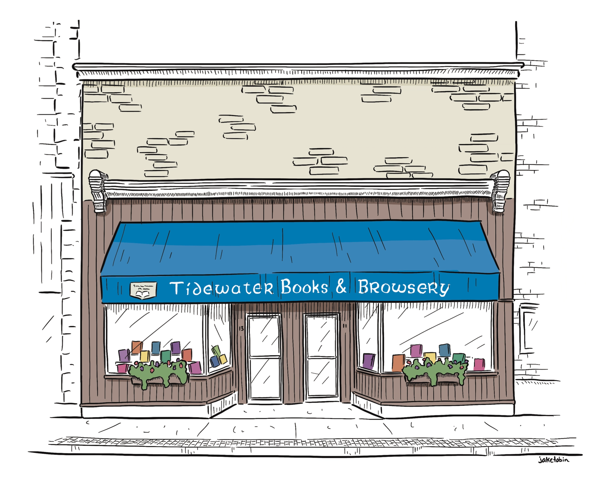 A whimsical take on Tidewater Books and Browsery in Sackville, NB. Part of a series of bookstore prints.