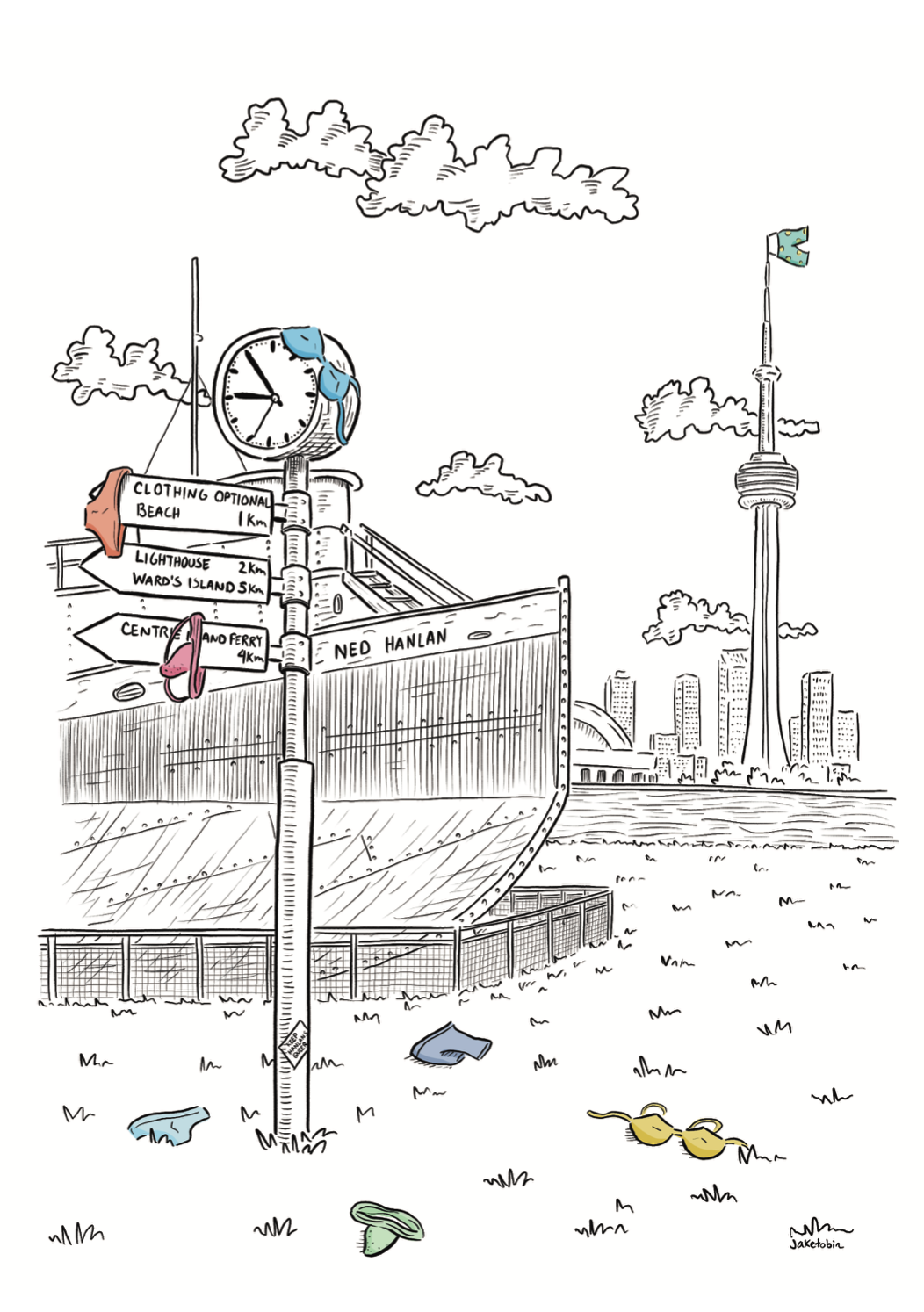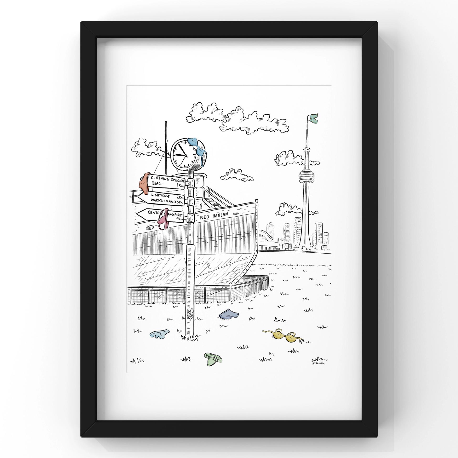 Part of a series of four Hanlan's Beach illustrations that celebrate Toronto’s historic nude beach and its legacy as a queer space. Anchored in signage found around the beach, each illustration is meant to elicit a cheeky "iykyk" vibe.